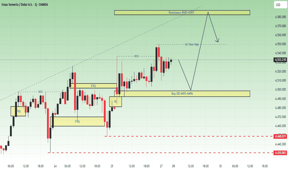 Harga emas berada dalam aliran menaik (uptrend) dengan struktur Higher High & Higher Low, menunjukkan momentum beli yang kuat.