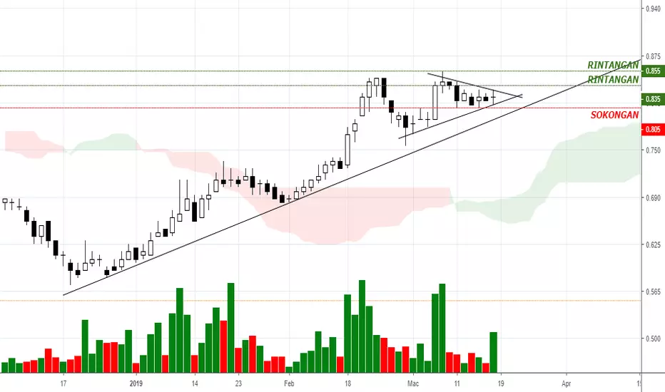 1) Harga kaunter MRCB pada tarikh 18/03/19 berada dipenghujung corak segitiga dan