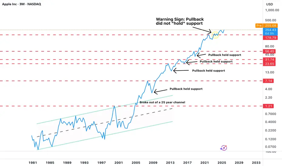 I was going through quarterly stock charts for long ideas and couldn't help but see that in 2023 & 2024 AAPL could not hold "closing" support after what would have been considered a "normal" pullback in 2022. Throw in Berkshire Hathaway selling 69% of it's total AAPL position to date. Plus, it seems to have become a stagnant company...it just hasn't produced anything amazing/cool for a while now. Needless to say, it's got me putting AAPL on my short ideas.