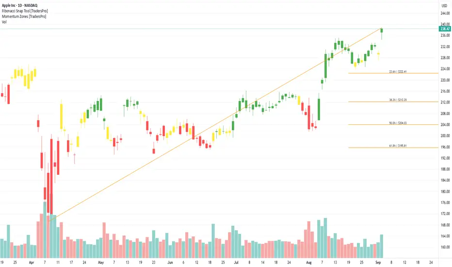 On the chart, a confirmation bar with rising volume shows bullish strength. The price has entered the momentum zone by moving above the .236 Fibonacci level. A trailing stop can be set just below this Fibonacci line using the Fibonacci snap tool, helping traders secure profits while allowing room for more upside potential.