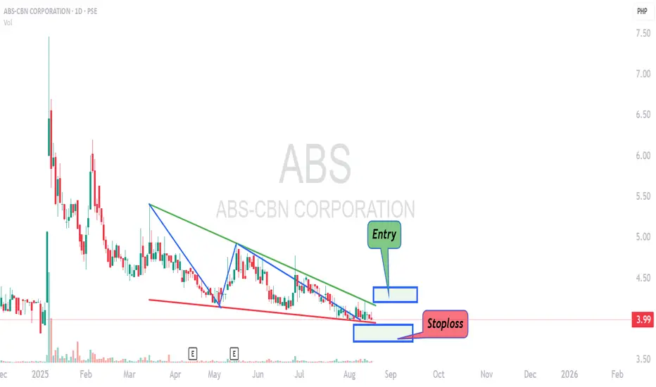 A Falling Wedge pattern showed up on ABS chart. It is a tradeable bullish reversal pattern. A falling wedge pattern is all about trendline resistance and trendline support. ABS price has been going up and down creating this narrowing range. If it breaks the trendline resistance then you have a bullish breakout. If it breaks the trendline support then you have a bearish breakout. Bearish breakout or what we call "breakdown" is useless right now in PSE market since there is no shorting available to retail traders yet as of writing this analysis.