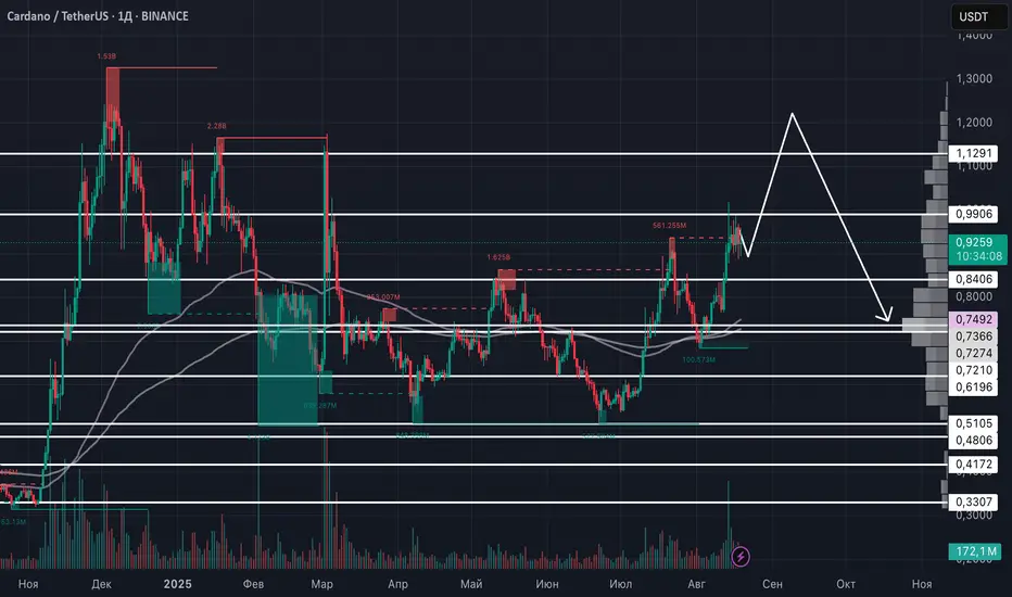 После роста ожидается коррекция: цена #ADA может упасть к 100-дневной скользящей средней (МА100) на 1D TF - 0.7274$. Это технический индикатор, часто выступающий как поддержка.