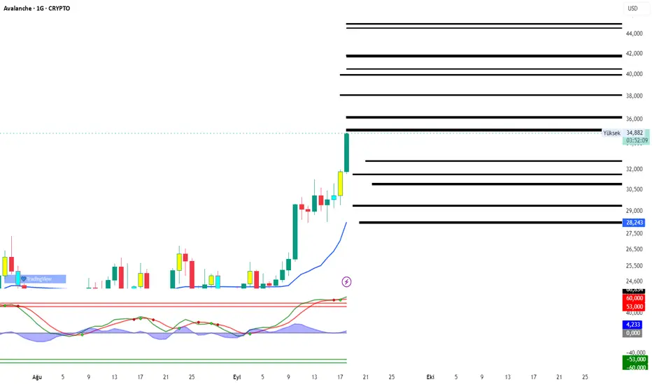 AVAX’ta planım net: şu an 34–35 bandında güç var; 33 üstünde kaldıkça önce 36 sonra 38 ve 41,5 denemesi beklerim, 41,5 üstü kapanış gelirse yol 47–51–55’e açılır, 55’in üstünde ise 65 ve üzeri konuşulur; geri çekilmede ilk karşılayacağım yer 31,6, altı olursa 30,2–29,8 ve 28,2 desteklerine bakarım, 28’in altı gelirse iş uzar ve 25–24,5 gündeme girer; göstergeler tepeye yakın olduğu için ara düzeltmeler normal, trend 20 günlük ortalama üzerinde korundukça yön yukarı, ben kırılım ve kapanışla adım adım ilerlerim.