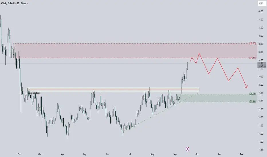However, the price is now approaching a new, crucial resistance zone between $34.56 and $38.16. This area previously acted as strong support before a significant downtrend. Based on my analysis, I anticipate a potential rejection from this zone, which could lead to a correction toward the previous resistance-turned-support area around $23.06 to $25.78.