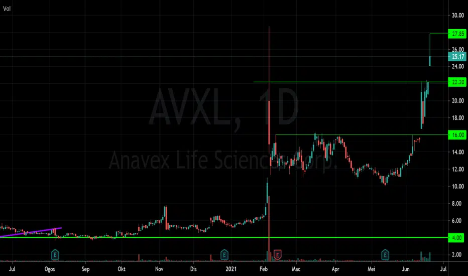 AVXL telah pecah rintangan 22.2 dengan gap dan volume tinggi dan berada pada paras tertinggi dalam sejarah.