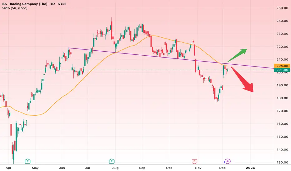 Boeing (BA) is currently retesting a long-term descending resistance (the purple trendline).