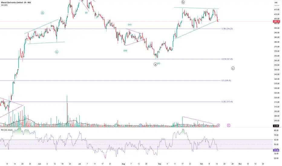 BEL stock has formed an ascending triangle. The breakout and the retest on the downside happened. The volume is also decreasing. The pattern may take support at the lower line and move upwards, or it may fall up to 361, the 0.618 Fibonacci ratio.