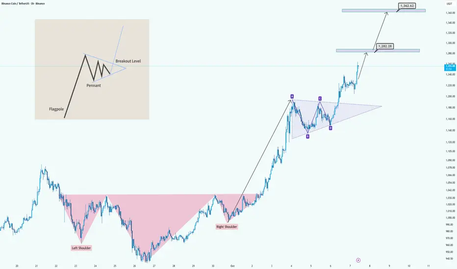 BNB/USDT: Bullish Breakout from H&S and Pennant Formation
