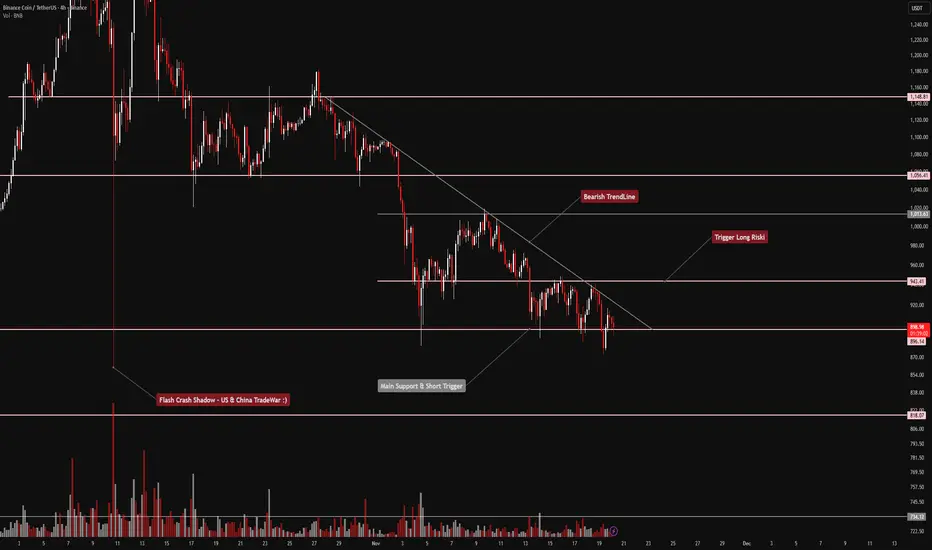 After the recent flash crash in the market, BNB entered a corrective phase. A descending trendline (dynamic resistance) has formed, and every time price touches it, we see a retracement.