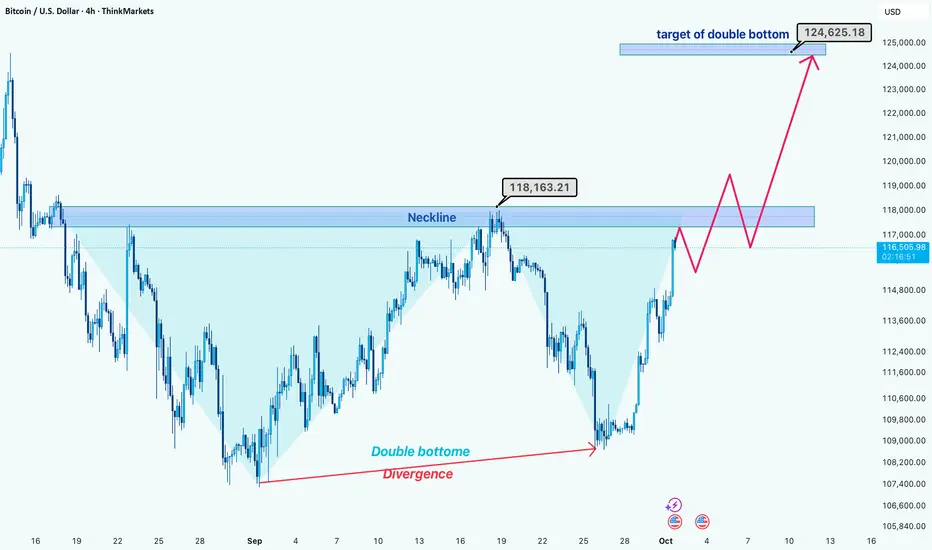 If confirmed, the double bottom pattern projects a target around $124,600, offering a solid upside potential from the current levels.