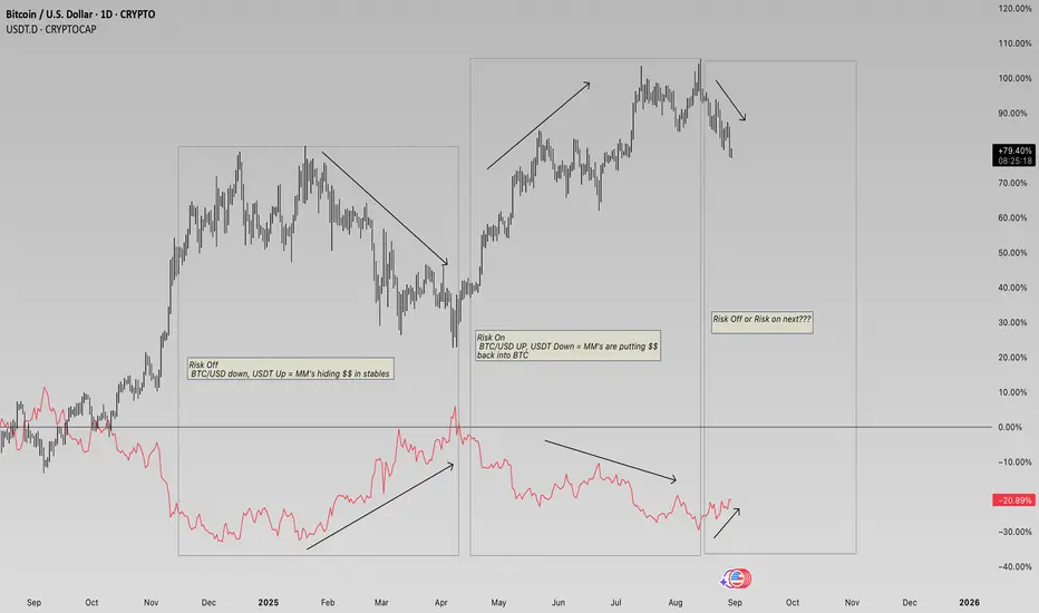 When BTC/USD is rising and USDT.D falls, that often signals risk-on behavior, as MM's are moving from stablecoins into Bitcoin.When BTC/USD falls and USDT.D rises, that signals risk-off, as people moving into stablecoins.