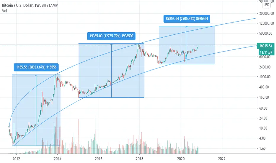 Putting some lines on a logarithmic chart can hopefully give us an idea about where we should expect to find a next all time high.