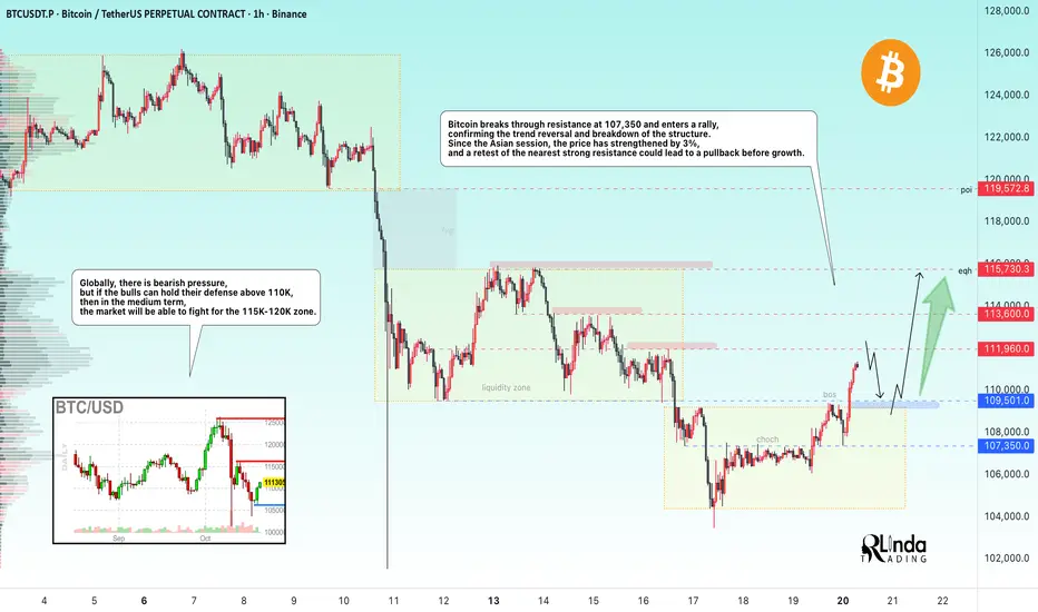 The fundamental background is unstable; if Trump continues to escalate the trade war, the cryptocurrency market may close within the range. However, technically, we have positive signs of a bull market. BTC is breaking through the resistance level of 107,350 and entering a rally, which only confirms the change in trend and the breakdown of the structure. Since the Asian session, the price has strengthened by 3%, and a retest of the nearest strong resistance at 112K-113.6K could lead to a pullback before growth.