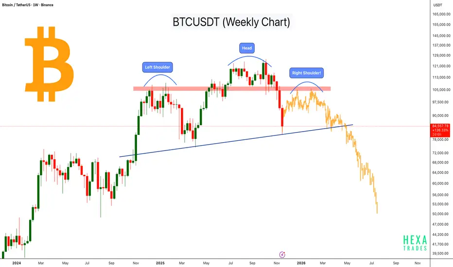 Bitcoin is developing a potential Head and Shoulders pattern on the weekly timeframe, a classic bearish reversal structure. The price has repeatedly rejected the major resistance zone marked in red, indicating strong selling pressure.