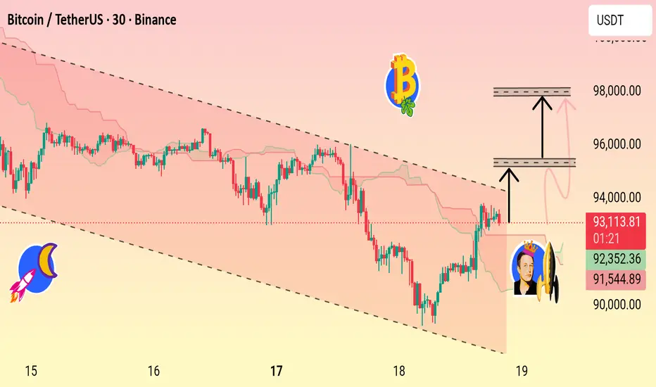 This chart shows BTC/USDT on the 30-minute timeframe as price pushes against the upper boundary of a multi-day descending channel. After a strong rebound from the lower trendline, Bitcoin is attempting to break out of the channel and move toward the highlighted resistance zones.