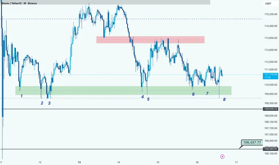 BTC has tested the same support zone eight times around the $110,000 – $110,300 range (highlighted in green).