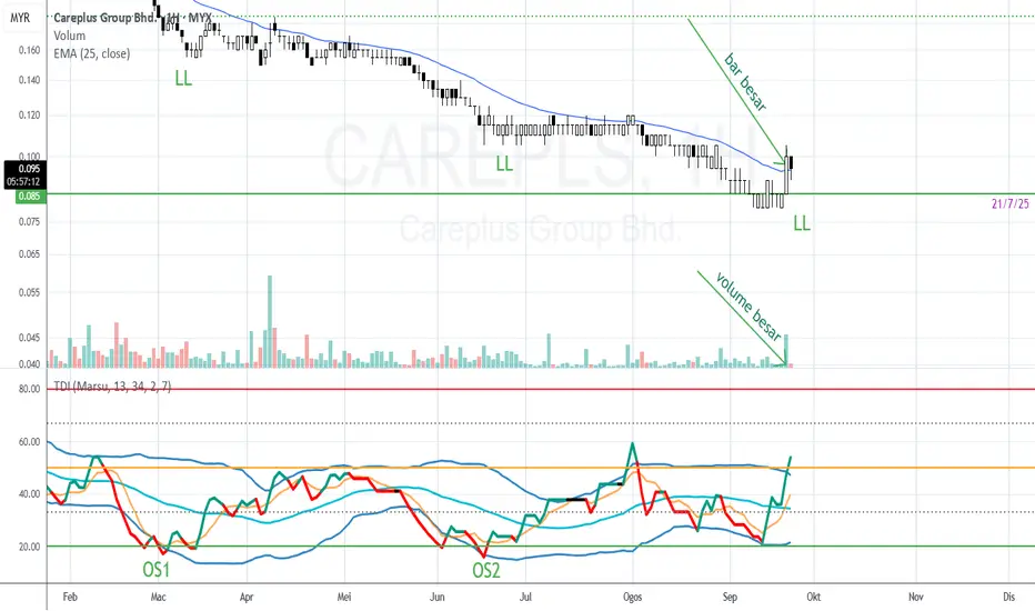 bermula Feb 2025 bar turun dari RM0.25 ke RM0.08 (terendah) dan berada dibawah ema25 membuat LL tiga kali dgn oversold pd Mac dan Jun. PL bergerak dari lower bollinger OS2 cecah > 50% pd Ogos kemudian lagi sekali 24/9. semalam 23/9 bar dan volume besar muncul. Bar tutup atas 25ema.