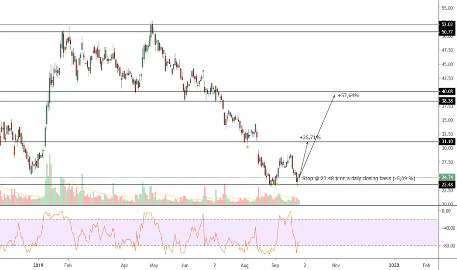 Expecting bounce from extremely oversold weekly and daily levels. If stop breached, be prepared to catch new daily reversal on lower levels with a tight stop.
