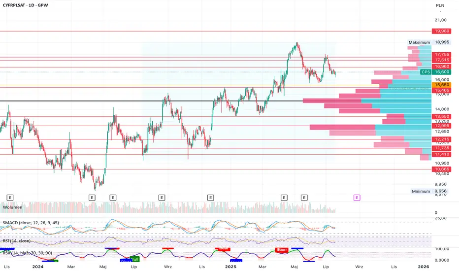 Na wykresie dziennym CPS widać, że po bardzo dynamicznym wzroście w pierwszym kwartale i drugim kwartale 2025 roku kurs akcji wyhamował, a następnie rozpoczęła się stopniowa korekta. Od szczytu na poziomie 18,99 zł, notowania skorygowały się do okolic poziomu 0,5 zniesienia Fibonacciego (~16,19 zł), który obecnie działa jako kluczowe wsparcie krótkoterminowe.