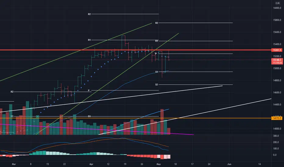 I don't know if we gonna see new lows, but I think a traget around 14940 is possible. As you know from my former posts, I am keen to see 14,600 and if it would hold, confirms the break-out of the white channel. Let's see where its gonna take us.