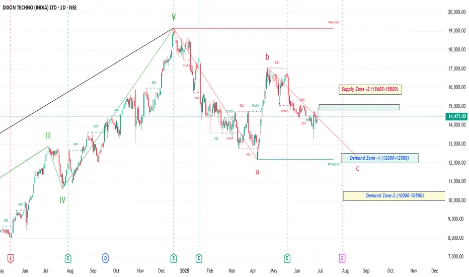 • The demand zone (Strong Low) is around ₹12,000–₹12,500, which could act as a strong support for potential reversal if wave C completes.