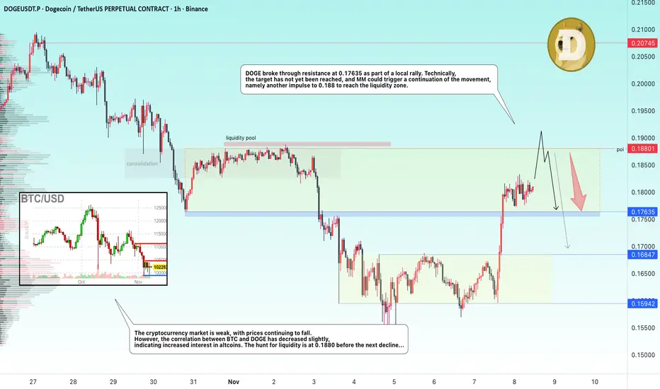 In the current situation, DOGE may test the resistance zone of 0.188 due to the liquidity pool formed as part of local consolidation in early November. However, this liquidity pool may become a resistance to growth, which in turn may provoke a reversal and a fall.