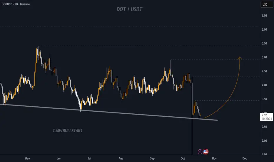 Polkadot (DOT) is currently retesting a key long-term ascending support trendline that has held since early 2024. After a strong correction and liquidity sweep below recent lows, the price is showing signs of stabilizing around the $2.80–$3.00 area.