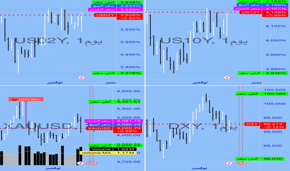 الذهب عامل انعكاس صعودي قوي على اليومي بحجم كبير في بيئة ماكرو لسه مش مثالية بس بدأت تهدّى (العوائد بتنزل شوية والدولار بيخف من فوق 100).