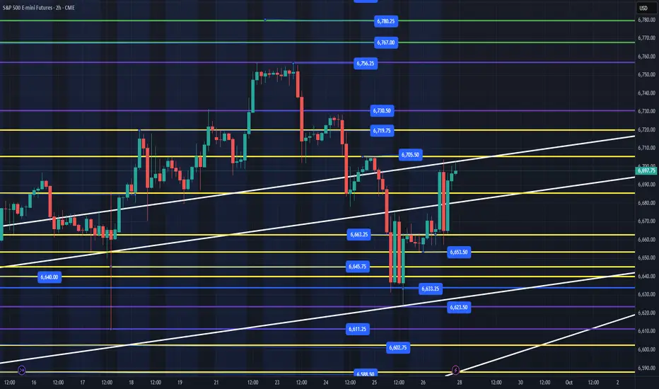 October 1st, 2025 - 2:20pm - UpdateWe are closing in on our first target of the week at 6767 with price currently at 6763. I do expect a little pullback overnight with continued strength tomorrow as we head into the Jobs Report (Or not) based on the shutdown. I currently see us not losing 6740 on any back test and continue up to 6781 this week, which should be a strong resistance.