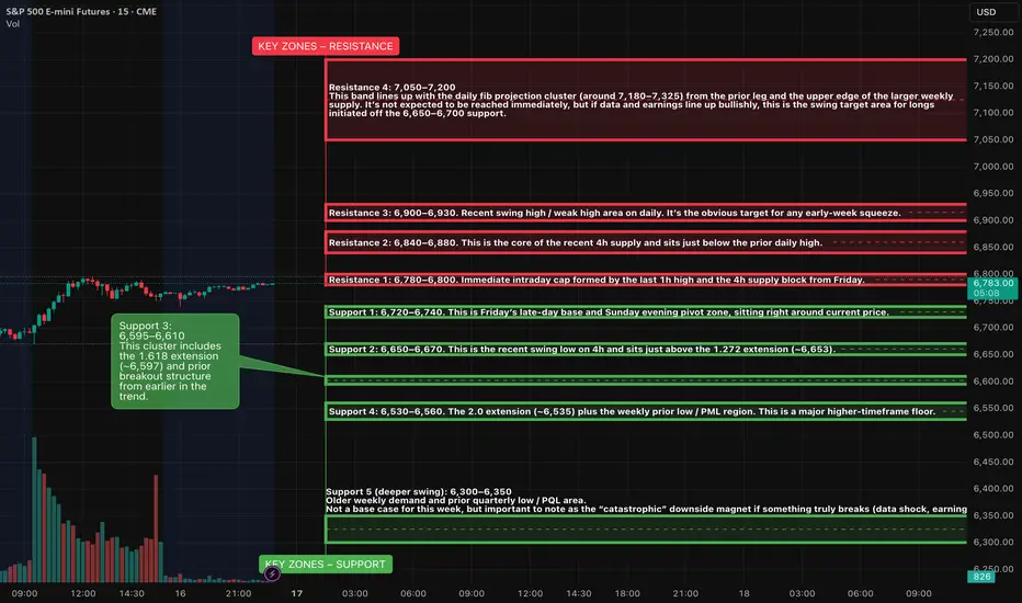 While ES is stuck inside this intraday box, there is room for mean-reversion trades: buying dips into 6,720–6,730 and selling pushes into 6,770–6,780 with tight intraday stops. This is a lower-quality idea compared to the bigger levels, but it’s relevant if Monday and early Tuesday stay choppy while everyone waits for the meat of the calendar mid-week.