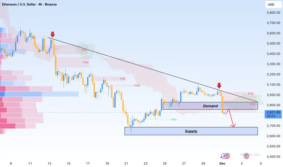 ETH printed a strong 4H bearish candle as soon as price retested the 3,030–3,100 supply zone, confirming that sellers still dominate this area. The sequence of lower highs remains intact, and the sharp break below 2,900 with increased volume signals a genuine sell-off rather than a routine shakeout.