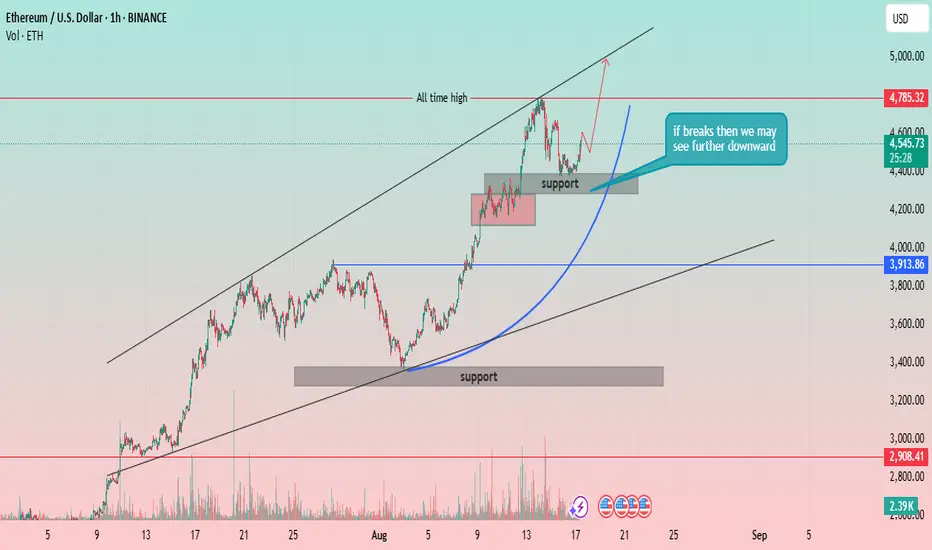 A key annotation states, "if breaks then we may see further downward." This highlights the importance of the 4,200 USD support zone. A break below this level could indicate a potential deeper retracement, possibly towards the lower trendline of the channel or the major support zone.