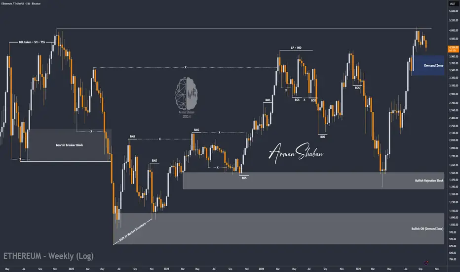 By analyzing the Ethereum chart on the weekly timeframe, we can see that the price is finally entering the $3,300–$3,900 demand zone. Soon, we should expect stronger buying pressure in this area. The possible upside targets for this move are $4,200, $4,600, $4,950, $5,500, and $6,000. Keep a close eye on how the price reacts to this key zone!Nota