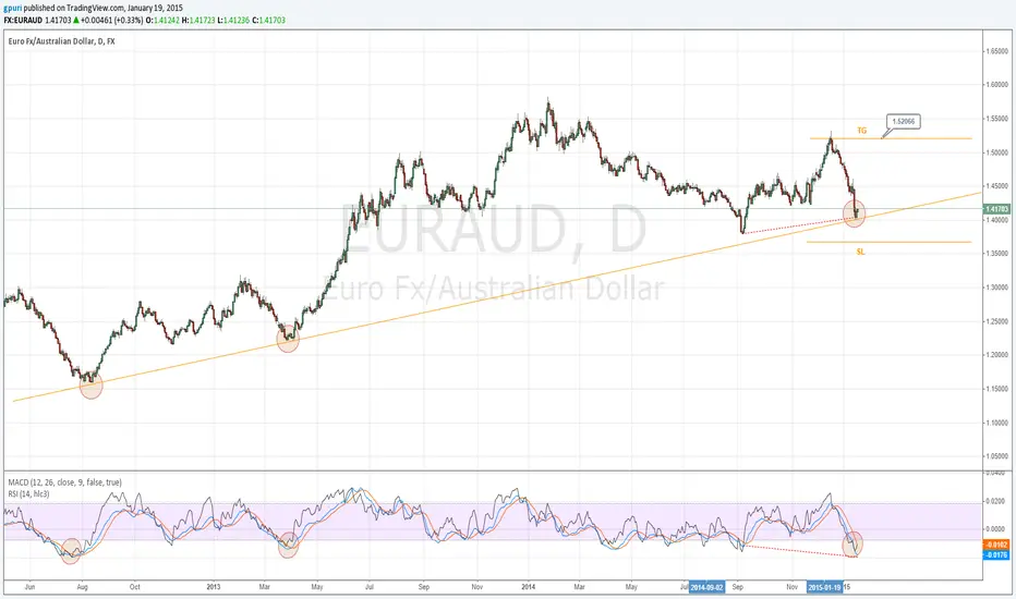 EURAUD bouncing off trendline bottom with hidden bullish divergence. If holds, Target can be set at 1.5200 handle with a stop loss just below the prior swing low at 1.3675