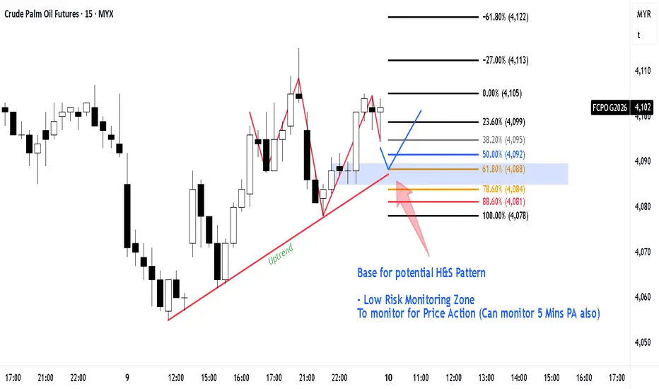 Di sesi FCPO pre-opening, saya menjangkakan carta berpotensi membentuk corak Head & Shoulders pada timeframe 15 minit. Namun, pemerhatian terhadap Price Action di zon jangkaan reversal adalah keutamaan.
