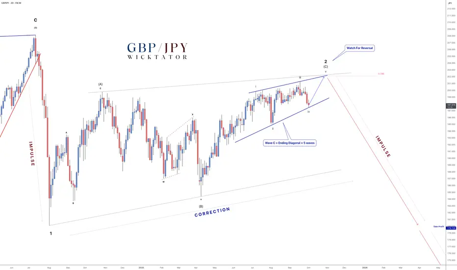 In our last setup for GBPJPY, we identified a massive diagonal pattern, with price completing wave 4 and preparing for a multi-year drop into wave 5.