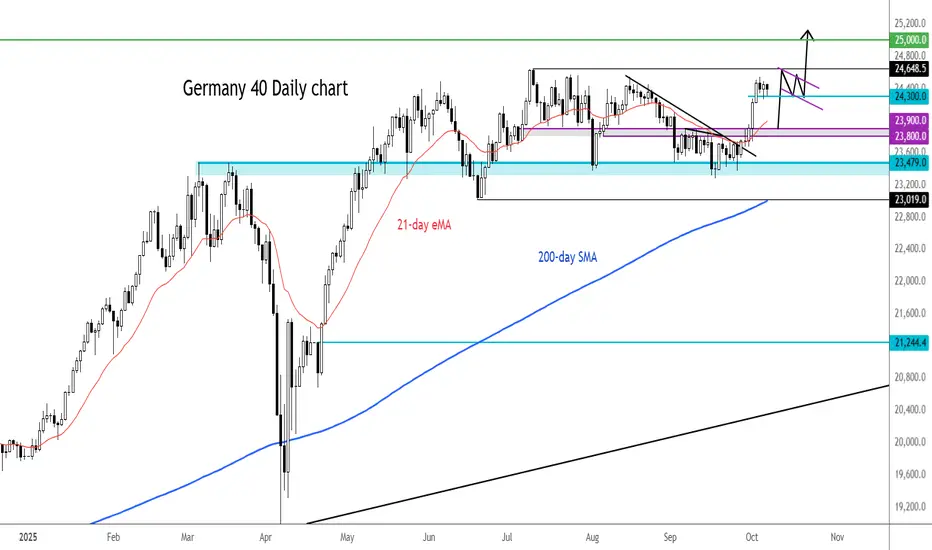 Following last week's powerful rally, the DAX’s overall uptrend remains intact, with this week's consolidation serving as a healthy pause for momentum to reset. As long as short term support around 23,750 holds, any pullbacks could be supported by the bullish traders looking to chase momentum, rather than signs of weakness. Even if the index dips a bit lower, this wouldn't necessarily invalidate the bullish breakout, but ideally the 23800-24000 area will need to hold.