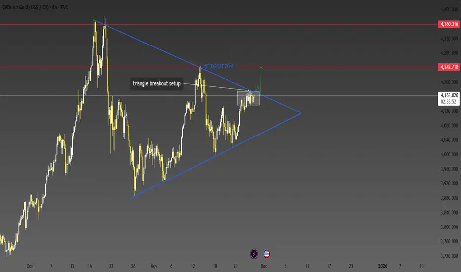 A clean breakout and sustained close above the triangle’s resistance would confirm the triangle breakout setup, opening the path toward the first target zone near $4,242. A stronger continuation could extend toward the higher resistance level around $4,360.