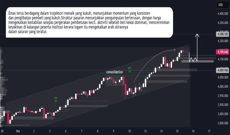 Emas terus didagangkan dalam trajektori menaik yang kukuh, menunjukkan momentum yang konsisten dan penglibatan pembeli yang teguh. Struktur pasaran menunjukkan pengumpulan berterusan, dengan harga mengekalkan kestabilan selepas pergerakan pembetulan kecil. Aktiviti sisi belian kekal dominan, mencerminkan keyakinan di kalangan peserta institusi kerana logam itu mengekalkan arah alirannya dalam saluran yang teratur. Walaupun penarikan balik jangka pendek mungkin berlaku untuk jangka masa pendek yang mengimbangi semula kecairan yang lebih lama. berterusan dan permintaan terus menyokong penilaian yang lebih tinggi.