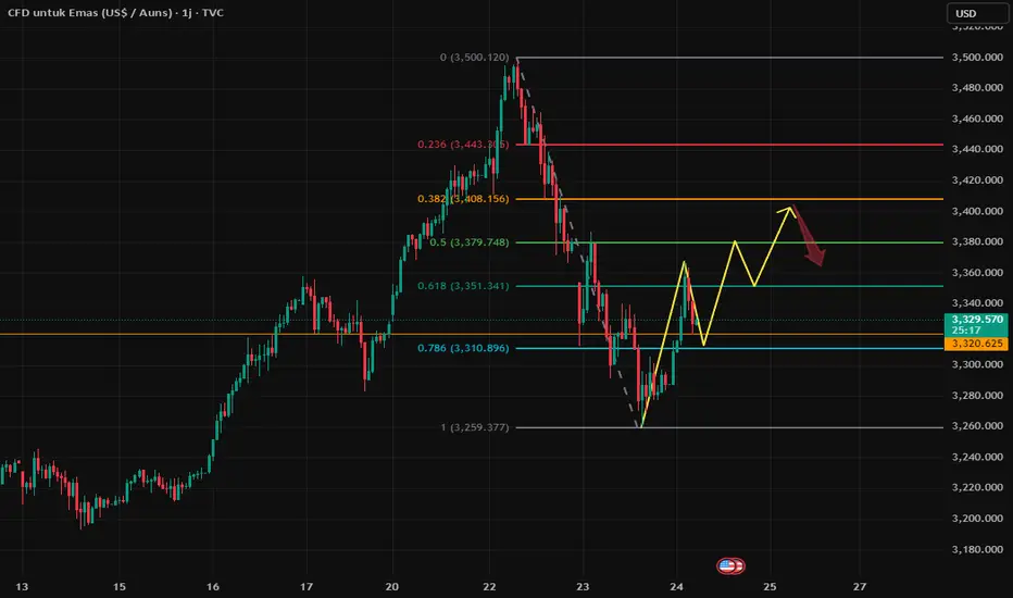 Jual: 3387-3390, SL: 3400, TP: 3370-3350;