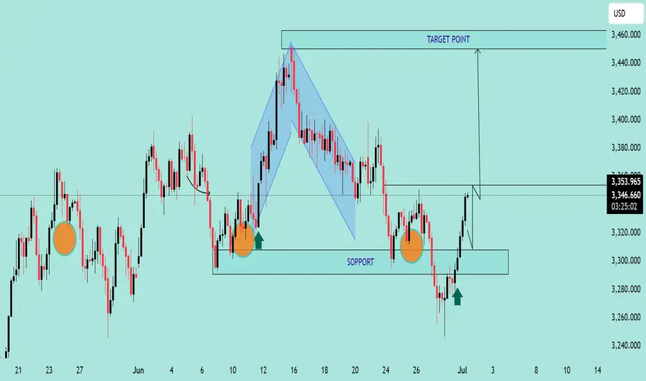 Harga berjaya menembusi rintangan kecil sekitar 3,340 USD, mengesahkan momentum menaik. Retest ditunjukkan dengan anak panah hijau 🟢.
