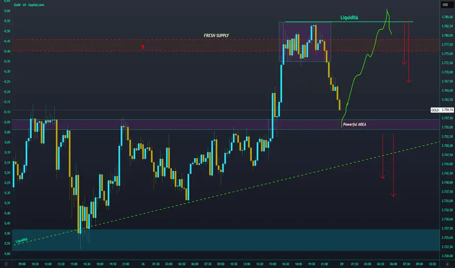 Notate come è crollato nell'ultima serata, vorremmo unirci a tale movimento ma dobbiamo fare attenzione al supporto alla quale ci stiamo avvicinando, la "powerful area", che potrebbe portare ad ulteriore rialzo, magari in ricerca della liquidità del massimo assoluto di Venerdì.