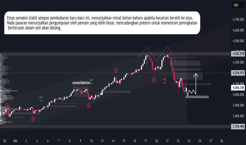 Emas menunjukkan tanda-tanda kemasukan semula pembeli selepas tempoh pergerakan menurun terkawal. Kecairan baru-baru ini di sekitar julat yang lebih rendah menunjukkan bahawa tekanan jualan jangka pendek telah diserap sebahagian besarnya, mewujudkan keadaan yang menggalakkan untuk potensi pengembangan menaik.
