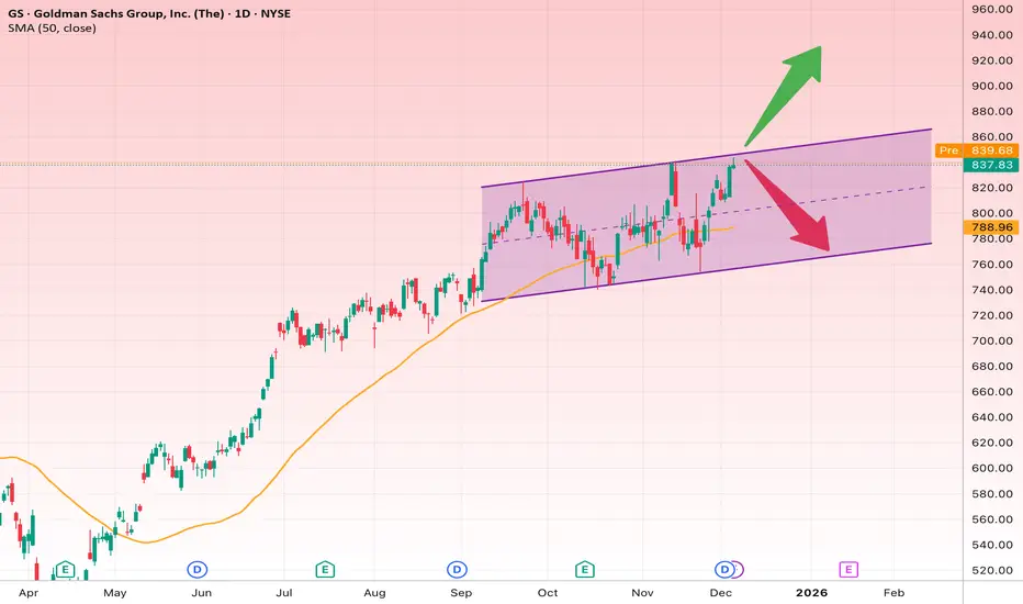 If GS can break and hold above 840, it signals a clean breakout from the channel top and opens the door for a fresh upward rally.
