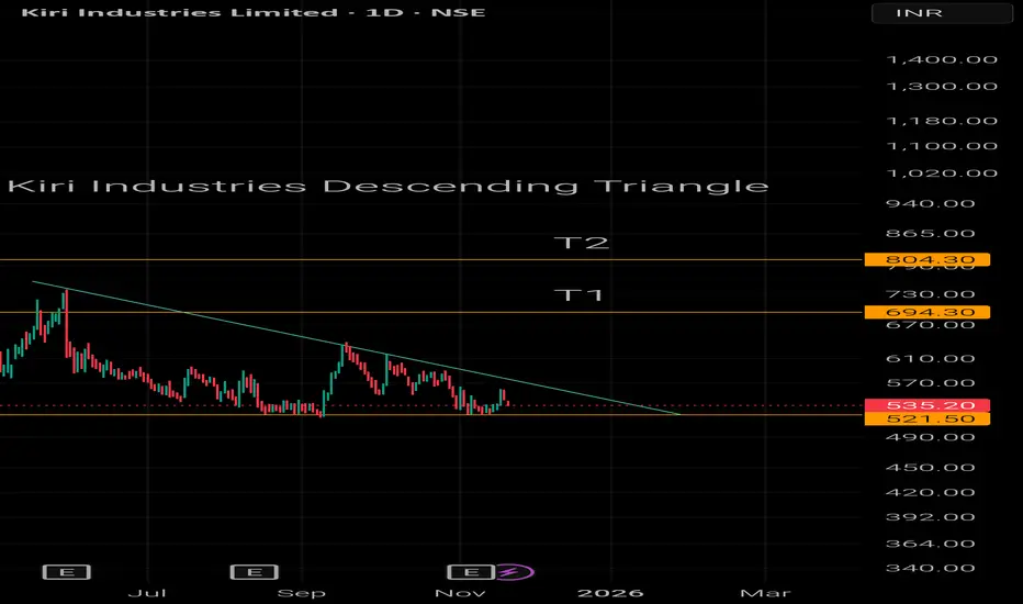 Kiri Industries is forming a Descending Triangle Pattern and can expect it to go up. The immediate targets can be set at 694 and 804 which are immediate targets set From Fib Retracement.