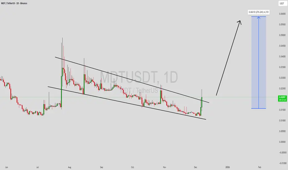 MDTUSDT is forming a clear falling wedge pattern, a classic bullish reversal signal that often indicates an upcoming breakout. The price has been consolidating within a narrowing range, suggesting that selling pressure is weakening while buyers are beginning to regain control. With consistent volume confirming accumulation at lower levels, the setup hints at a potential bullish breakout soon. The projected move could lead to an impressive gain of around 190% to 200% once the price breaks above the wedge resistance.