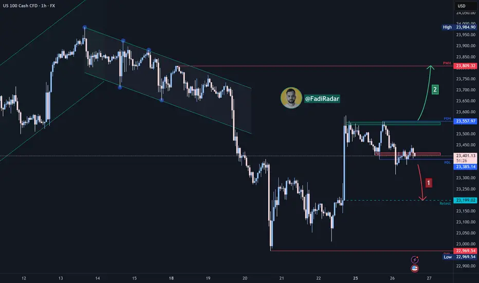 Should a rebound signal appear and the price successfully breaks and holds above 23,560, this could support a continued rally toward 23,800.