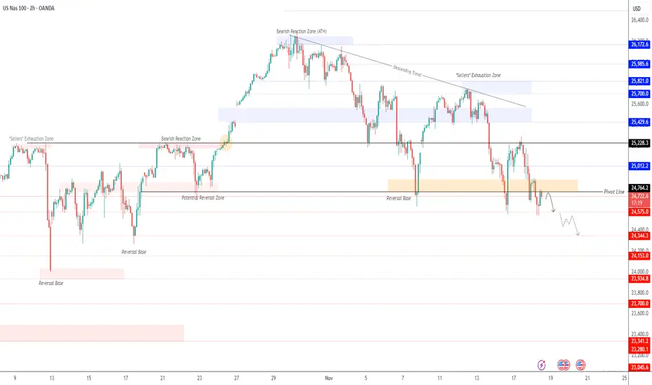 USNAS100 maintains a bearish structure while below 24770, with deeper downside risk if 24390 breaks.