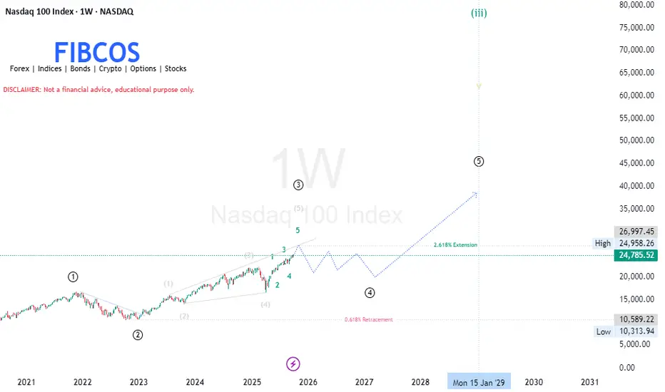 The index (NASDAQ) continues its macro impulsive structure, now expanding through Wave (3) — targeting the 2.618 Fibonacci extension near 26,997(27K).