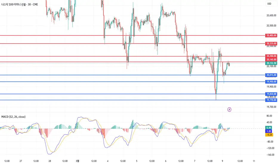 나스닥은 아래꼬리 길게 달며 상승마감하였습니다. 연결선물로 주봉상 60주선에서 반등한 모습으로, 일봉상의 240일선을 하회하였으나 반등에 성공한 모습입니다. 먼저 주봉상으로 보자면 2주전 장대음봉이 박스권을 강하게 이탈하는 형태를 만들어내었고, 지난주는 3주선에서 저항맞고 하락한 모습입니다. 따라서 이번주는 5주선인 21050부근까지 반등할 가능성을 열어두고 보는 게 좋은 구간입니다. 일봉상으로 본다면 19800을 기점으로 지지반등에 성공한 모습으로, 박스권을 형성하면서 지지반등할 가능성이 높다고 볼 수 있겠습니다. 일봉의 240일선의 특징을 생각한다면 60일선인 21500까지 반등의 여력이 남아있으나, 현재 하락세가 강하다보니 반등까지 시간이 꽤 걸릴 것으로 보입니다. 따라서 스윙전략을 가져가더라도 급등하는 모양새가 나오기는 쉽지 않아서 240일선 부근에서 박스권을 형성할 가능성이 높으니 참고하시기 바랍니다. 240분봉상으로는 다이버젼스를 형성하며 골든크로스를 만들고 주가가 반등하는 모습입니다. 바닥을 다지는 그림을 만들더라도 지속적인 반등시도가 나올 수 있는 구간이니 매도 추격에 주의하시기 바랍니다. 이번주는 수요일 소비자물가지수와 목요일 생산자물가지수 발표를 앞두고 있으니 변동성 확대에 주의하시기 바랍니다.